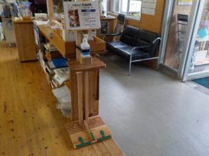 「ステップシャワースタンド」は、木製の非接触型手指消毒装置で、足元にある踏み板を踏むことでアルコール除菌スプレーのポンプを押すことができ、ポンプに触れることなく手指消毒ができる商品です。