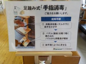 「ステップシャワースタンド」は、木製の非接触型手指消毒装置で、足元にある踏み板を踏むことでアルコール除菌スプレーのポンプを押すことができ、ポンプに触れることなく手指消毒ができる商品です。