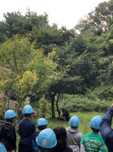 ② 校庭に移動して、ヘルメットと腰鋸、軍手を一人ずる準備する。