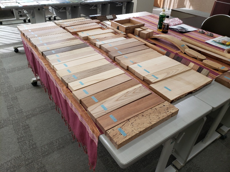 ↑様々な樹種の板材の展示(硬いもの・柔らかいもの、重いもの・軽いもの様々ありました)