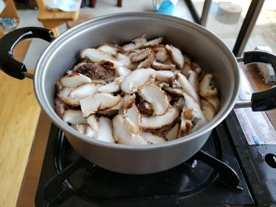 細かく切ったシイタケを鍋に入れ、煮ていきます。