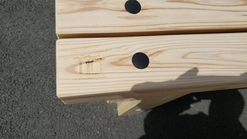 オリンピック・パラリンピックの選手村で使用された材を活かすため、最小限の加工しかしていないテーブルとベンチになっています。