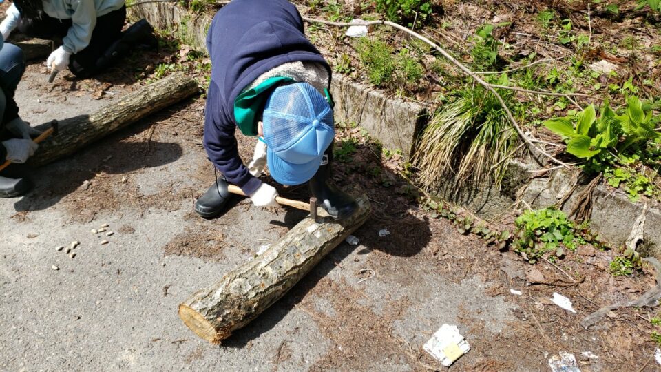 午後からは荒川口に移動し、しいたけの駒打ち体験をしました。