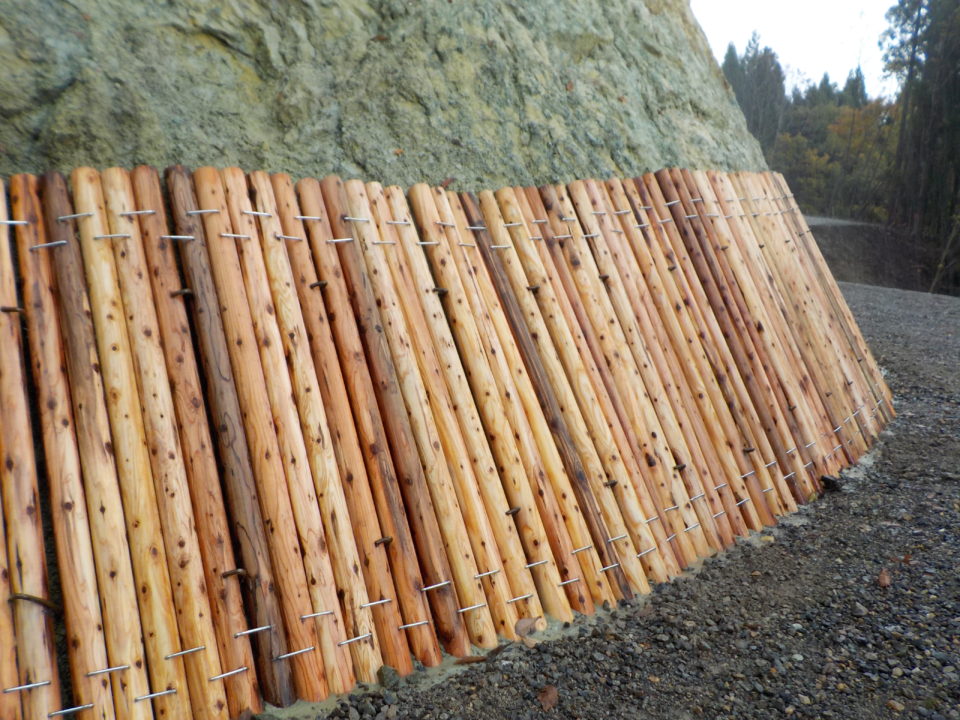 上の写真が丸太伏工です。丸太伏工の施工目的は切土法面の保護です。今回の高地沢林業専用道の地質は特にもろい地質だったこともあり、丸太伏工の効果が十分に発揮されていることが確認できました。また、木材を利用することで景観も自然と調和して美観が保たれる効果もあります。