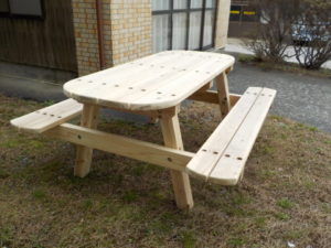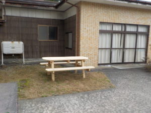 また、当組合の正面玄関先に木材加工課が製作した木製テーブル・ベンチも設置しております。