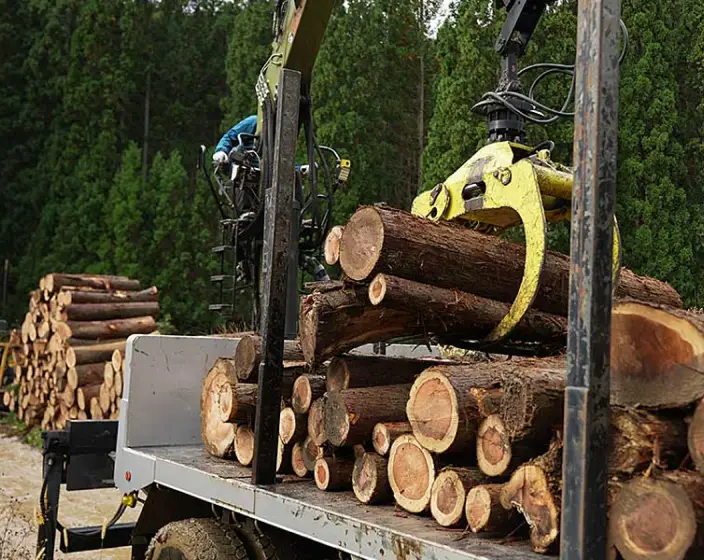 高性能機械を駆使して低コスト生産体制を確立し、組合員をはじめ森林所有者の所得向上と地域材の安定供給を図ります。