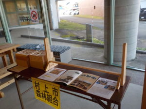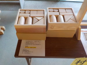 村上市の木育事業の一環で乳幼児に配布予定の「木製積み木セット」(写真 右)、通常販売用の木製積み木を出品いたしました。