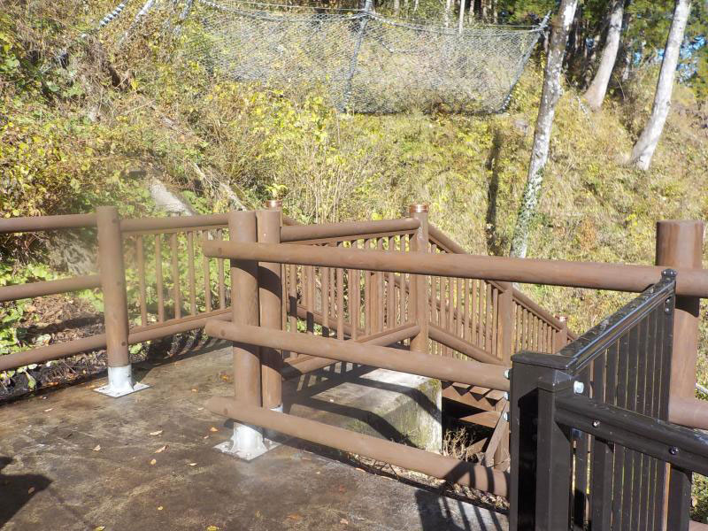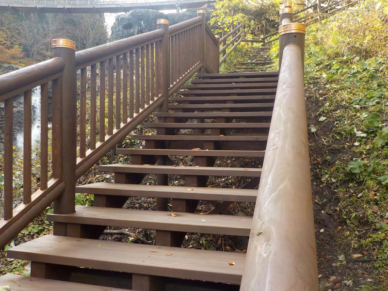 出来栄えも上々。自然景観とマッチし、階段部、防護柵ともに耐久性も向上。温泉客も安心して散策出来ます。