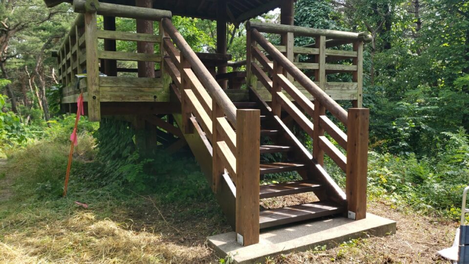 令和5年6月某日、村上市上の山地内にある森林公園の東屋に接続する階段を修繕しました。